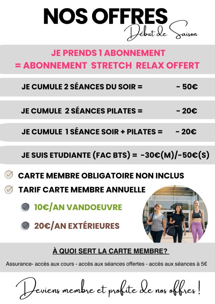 - Adhésion à un Abonnement donne droit à une séance OFFERTE : STRETCHING Lundi 12h15 à 13h